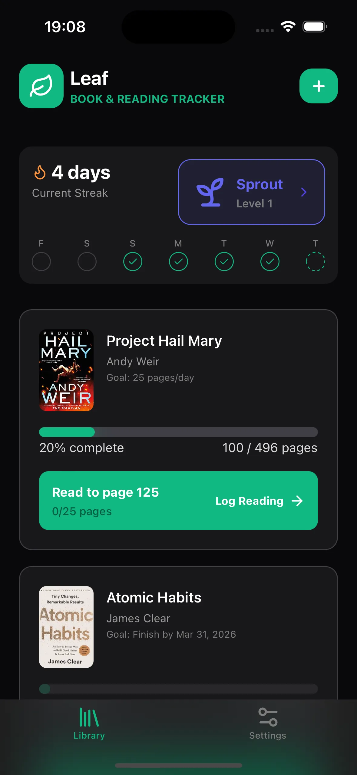 Set your finish date and Leaf calculates exactly how many pages you need daily. It adjusts if you miss a day.